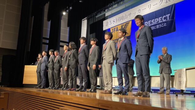 表題の件ですが、2/11(日)に山陽新聞社さん太ホールにて、2023年度岡山県サッカーリーグの表彰式がありました。ENEOS水島は、県1部リーグ優勝の表彰と、チーム内より7名がベストイレブンに選出いたしましたので、報告します。